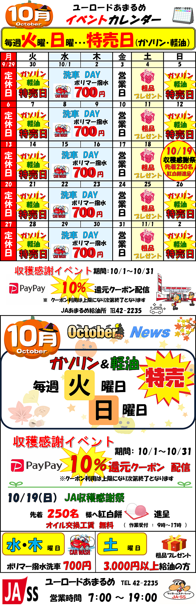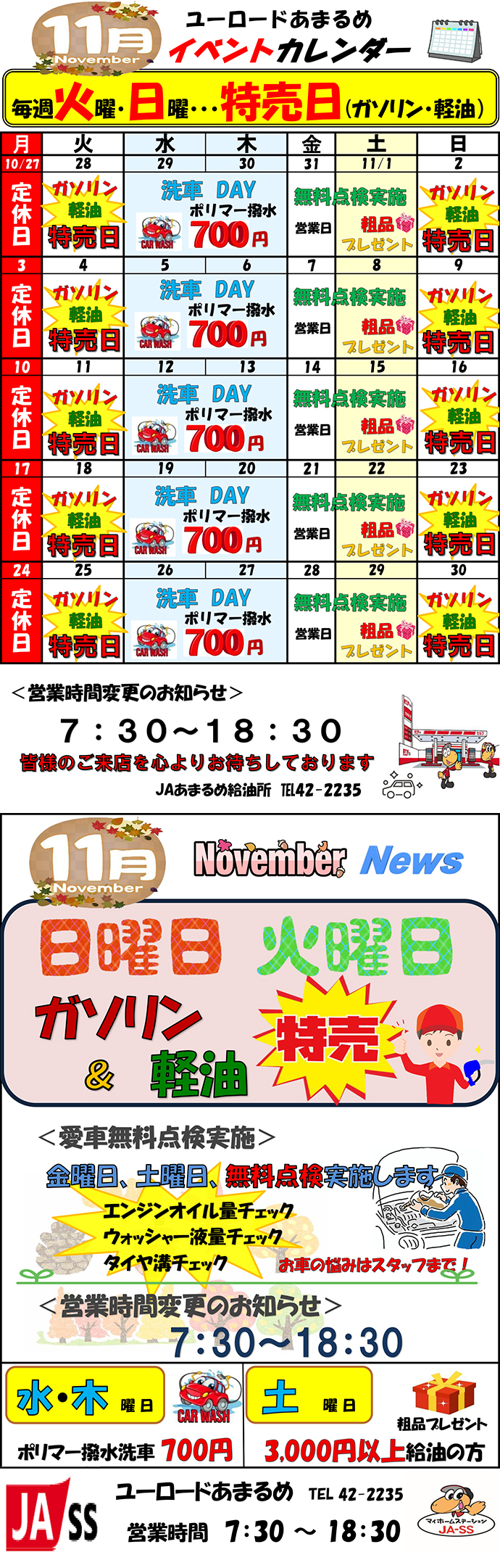 ◎毎週(火・日曜日)はガソリン、軽油を特価で販売中ぜひご利用下さい。