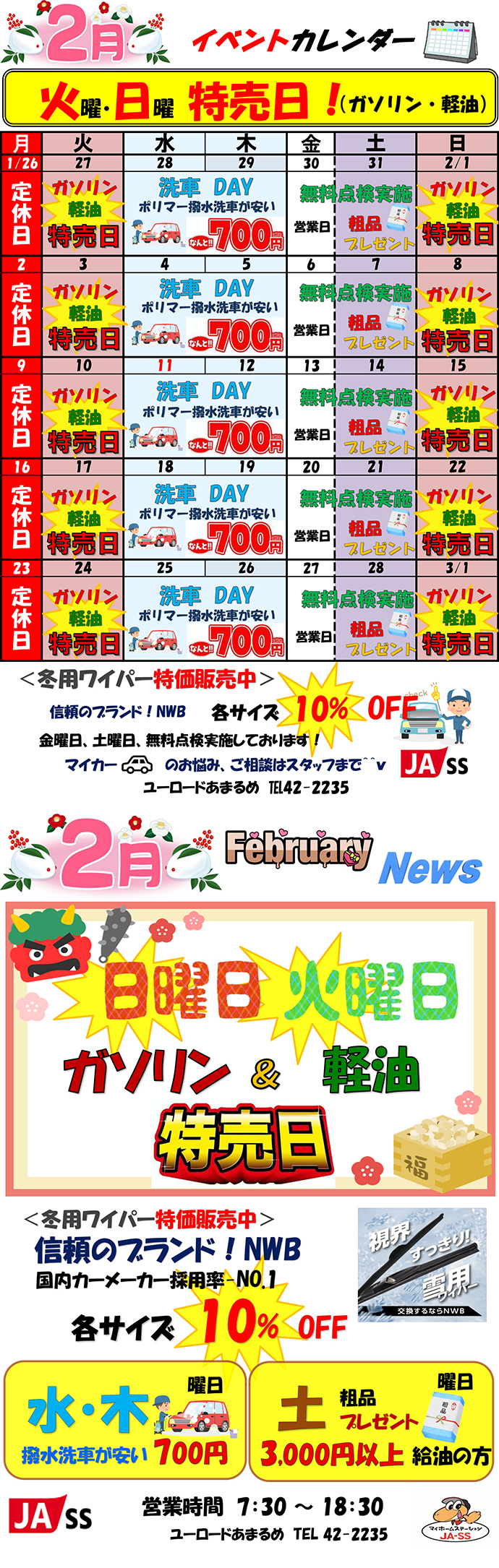 ◎毎週(火・日曜日)はガソリン、軽油を特価で販売中ぜひご利用下さい。